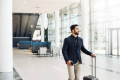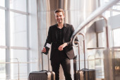 przystojny biznesmen w garniturze siedzi na kanapie i trzyma gazetę