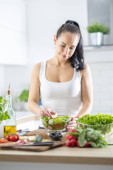 Młoda kobieta przygotowuje sałatkę warzywna w swojej kuchni. Zdrowe li
