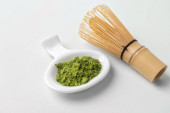 Widok z góry drewnianej łyżki z proszkiem zielonej herbaty Matcha na białym stole