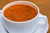 Borsch w głębokim białym talerzu na czarnym drewnianym stole