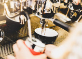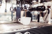 W kawiarni z bliska znajduje się ekspres do kawy. efekt rozmycia len. Proces w stylu Vintage