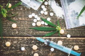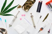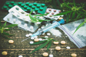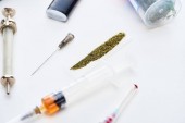 z bliska widok na liść konopi, srebrna łyżka, strzykawka, heroina i LSD