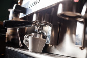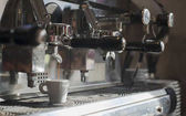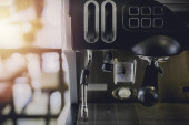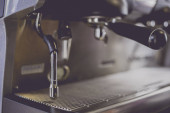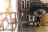W kawiarni z bliska znajduje się ekspres do kawy. efekt rozmycia len. Proces w stylu Vintage