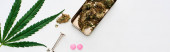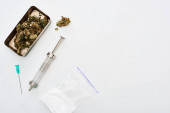 Widok z góry na pąki marihuany, liść konopi, heroina, pigułki i strzykawki na białym tle