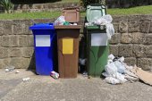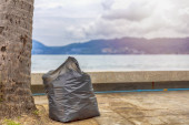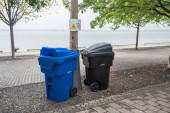Zielony i niebieski pojemnik na różne zbiory surowców na chodnik w pobliżu plaży