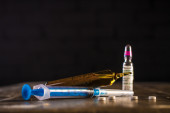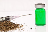 zbliżenie ampułki, strzykawek, heroiny i konopi na białym tle