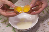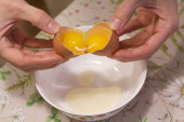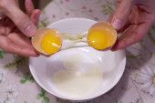 Dwa żółtka w jednym jajku. 2 w 1. Ręce kobiet otworzyć unikalne jajko Wi