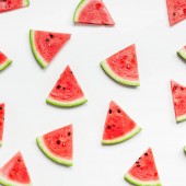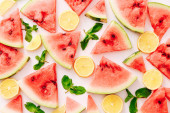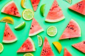 Świeże plastry arbuza z wapna, mięty i lodu na ciemnym tle. Widok z góry.