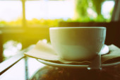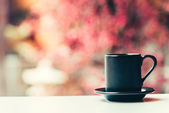 Biały Coffee Cup na stole z bokeh Nature tle