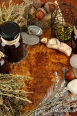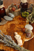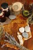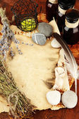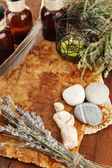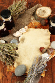 Kompozycja z stare papiery, zioła, kamienie i butelki z symboli na drewniane tła