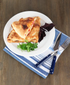 Pizza calzone na płytkach na serwetki na stół drewniany