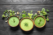 Widok z góry na smaczny zielony kremowy zupa z grzankami, serem i szpinakiem na teksturowanym szarym tle