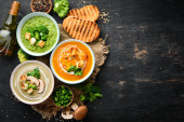 Zdjęcie "Widok z góry na składniki w płytce w pobliżu zielonej śmietany i drewnianej deski do krojenia" może być wykorzystywane do celów osobistych i komercyjnych zgodnie z warunkami zakupionej licencji Royalty-free. Obraz jest dostępny do pobrania w jakości wysokiej rozdzielczości do 5760x3840.