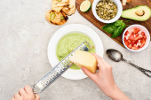 Widok z góry na pyszne kremowo-zielone zupy warzywne z grzankami podawane z łyżką na serwetce w pobliżu świeżych składników