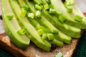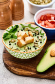 miska pysznej zielonej kremowy zupa z grzankami, czarny papryka i nasiona dyni w pobliżu dojrzałych awokado