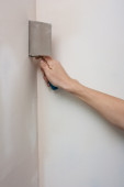 Zdjęcie "Bliska budowniczy pracujący z narzędziem szlifierki. Naprawa i Renowacja w domu. Nowy wystrój wnętrz. Pracownik szorowania ściany papierem piasowym i przygotować powierzchnię do malowania" może być wykorzystywane do celów osobistych i komercyjnych zgodnie z warunkami zakupionej licencji Royalty-free. Obraz jest dostępny do pobrania w jakości wysokiej rozdzielczości do 5760x3840.