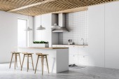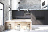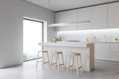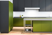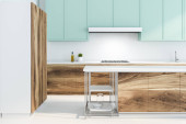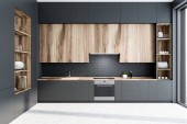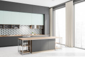Zdjęcie "Widok z boku szarej i niebieskiej kuchni z wyspą" może być wykorzystywane do celów osobistych i komercyjnych zgodnie z warunkami zakupionej licencji Royalty-free. Obraz jest dostępny do pobrania w jakości wysokiej rozdzielczości do 5760x3840.