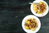 Zdjęcie "Warzywa na tle. Smażony sos cukinii w talerzu. Młode gotowane ziemniaki z koperkiem w misce. Smażone kurki z pieczonymi złotymi cebulkami w patelni. miejsce kopiowania" może być wykorzystywane do celów osobistych i komercyjnych zgodnie z warunkami zakupionej licencji Royalty-free. Obraz jest dostępny do pobrania w jakości wysokiej rozdzielczości do 5760x3840.