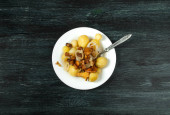 Warzywa na tle. Smażony sos cukinii w talerzu. Młode gotowane ziemniaki z koperkiem w misce. Smażone kurki z pieczonymi złotymi cebulkami w patelni. miejsce kopiowania