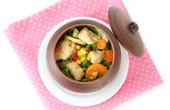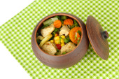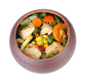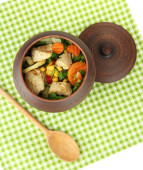 pieczone mieszane warzyw z piersi kurczaka w garnku, na białym tle