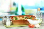 Zapiekanka z warzyw i mięsa, drewniany stół, na jasnym tle