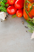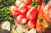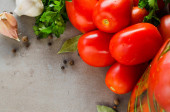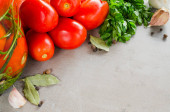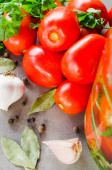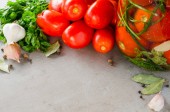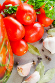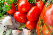 Przygotowanie marynowanych pomidorów konserwowych z ziołami, czosnkiem, solą i przyprawami.