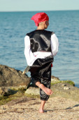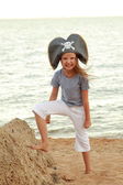 piękny wesoły dziewczynka w stroju pirata jest studiując mapę skarbów.