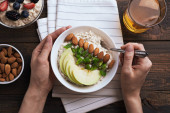 Widok z góry na szarym talerzu z soczystych, jasnych warzyw na konkretnym tle, awokado, cytryna, pomidor, papryka, ogórek i sałatka mozzarella