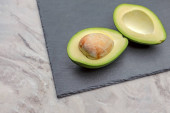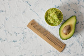 panoramiczny strzał z połowy awokado, luffa i pumeksu na powierzchni marmuru