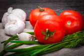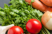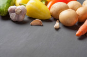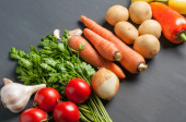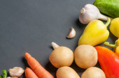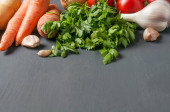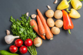Zestaw różnych świeżych, całych dojrzałych warzyw leży na ciemnym, betonowym stole. Kopiuj miejsce dla tekstu