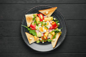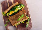 Kanapka z szynką, serem, pomidorami, sałatą i chlebem tostowym. Widok z góry izolowany na białym tle.