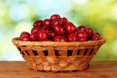 Dojrzałe śliwki w koszyku na drewnianym stole na naturalnym tle