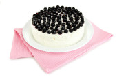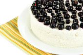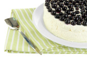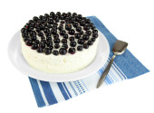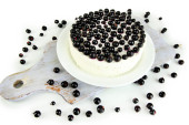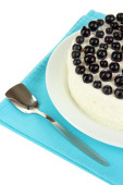 sernik z świeżych jagód na białym talerzu na białym tle