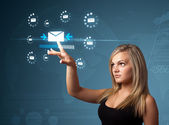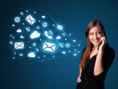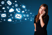 Młoda dama wykonująca połączenie telefoniczne z ikonami wiadomości