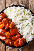 Pikantna wołowina gotowane z jabłkami w sosie pomidorowym z boku ryżu dis