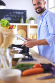 Człowiek po przepis na cyfrową tabletkę i gotowanie smaczne i zdrowe jedzenie w kuchni w domu