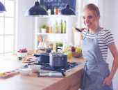 Młoda kobieta stojąca przy biurku w kuchni