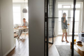 Zdjęcie "Współczesna dziewczyna fotografowanie żywności na stole dla jej wideo blogu stojąc w kuchni" może być wykorzystywane do celów osobistych i komercyjnych zgodnie z warunkami zakupionej licencji Royalty-free. Obraz jest dostępny do pobrania w jakości wysokiej rozdzielczości do 5760x3840.