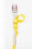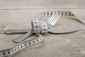 Widok z góry koncepcji otyłości z widelcem i taśmy pomiarowej na drewnianym tle z przestrzenią na kreatywne pomysły