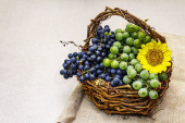 grupa zdrowych jesiennych kolorowych owoców w drewnianym koszu