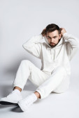 pełny widok długości poważny stylowy człowiek stojący z rękami w kieszeniach w pobliżu kurtyny