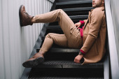 zamyślony człowiek w brązowym płaszczu siedzi na schodach i patrząc z dala