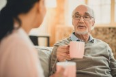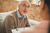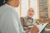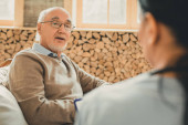 Wise Senior bezpośrednio patrząc na swojego lekarza, podczas gdy ona pracuje z nim