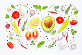 Zdjęcie "Różnych świeże warzywa i zioła na białym tle. " może być wykorzystywane do celów osobistych i komercyjnych zgodnie z warunkami zakupionej licencji Royalty-free. Obraz jest dostępny do pobrania w jakości wysokiej rozdzielczości do 5760x3840.