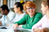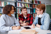 Zdjęcie "Wesoła dziewczyna i jej kolega słucha jednego z chłopaków, omawiając nowe kreatywne pomysły w klasie" może być wykorzystywane do celów osobistych i komercyjnych zgodnie z warunkami zakupionej licencji Royalty-free. Obraz jest dostępny do pobrania w jakości wysokiej rozdzielczości do 5760x3840.