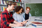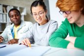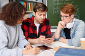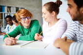 Wesoła dziewczyna i jej kolega słucha jednego z chłopaków, omawiając nowe kreatywne pomysły w klasie