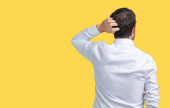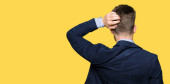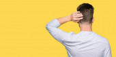 Zdjęcie "Młody przystojny lekarz mężczyzna noszenie płaszcz medyczny wstecz myśląc o wątpliwościami z ręką na głowie" może być wykorzystywane do celów osobistych i komercyjnych zgodnie z warunkami zakupionej licencji Royalty-free. Obraz jest dostępny do pobrania w jakości wysokiej rozdzielczości do 5760x3840.