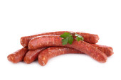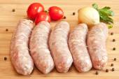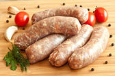 Raw meat sausages with greens isolated on white background