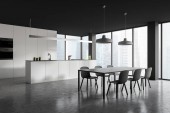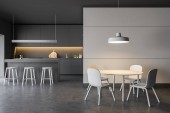 Zdjęcie "Szara kuchnia panoramiczna ze stołem" może być wykorzystywane do celów osobistych i komercyjnych zgodnie z warunkami zakupionej licencji Royalty-free. Obraz jest dostępny do pobrania w jakości wysokiej rozdzielczości do 5760x3840.