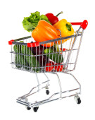 świeże warzywa w wózku na białym tle